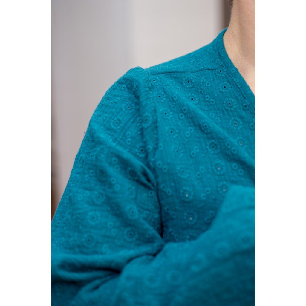 Rukávy lehce nabrané, zakončené gumičkou v 3/4 délce.